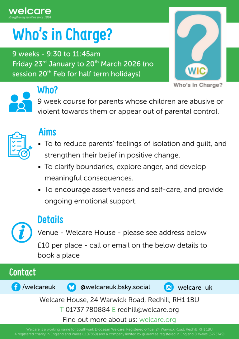 Welcare in Redhill is going to be running a 9-week Who’s in Charge? parenting programme starting in January 2026. For more details, please see the poster below.